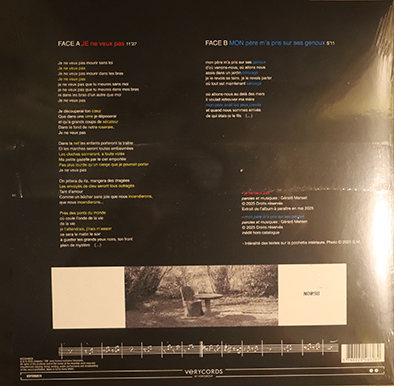 | Maxi 45 tours VERYCORDS 6022046628 à tirage limité et numéroté. Je ne veux pas (11'27'') - Mon père m’a pris sur ses genoux (5'11'') Prélude à son prochain album attendu début 2026 (et non pas mai 2025 comme indiqué sur la pochette). Seule la face A figurera sur l’album. Pour cette nouvelle sortie, MANSET – en fin de contrat chez Parlophone – a signé chez un nouveau label – Verycords – (crée en 2011 par Simon Tugel avec plus de 300 sorties à son actif) mais est toujours distribué en France par Warner Music. | |